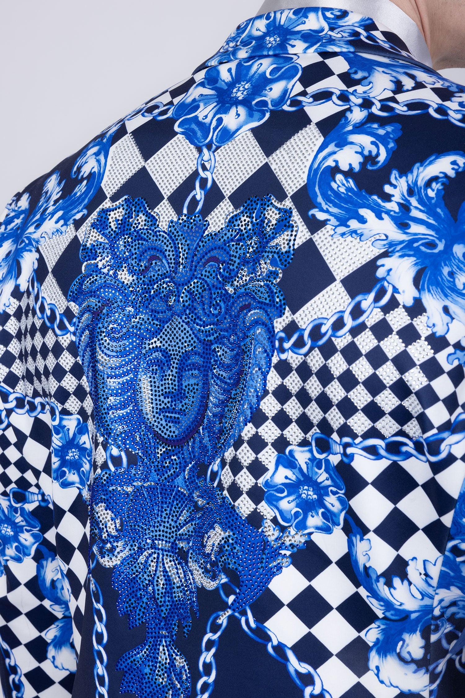 Expertly crafted with a slim fit, this Barabas men's blazer features a striking baroque design with a checkered print and Medusa detailing on the lining. Its bold style provides a luxurious, high-end look. The two-button closure completes the sophisticated look.
