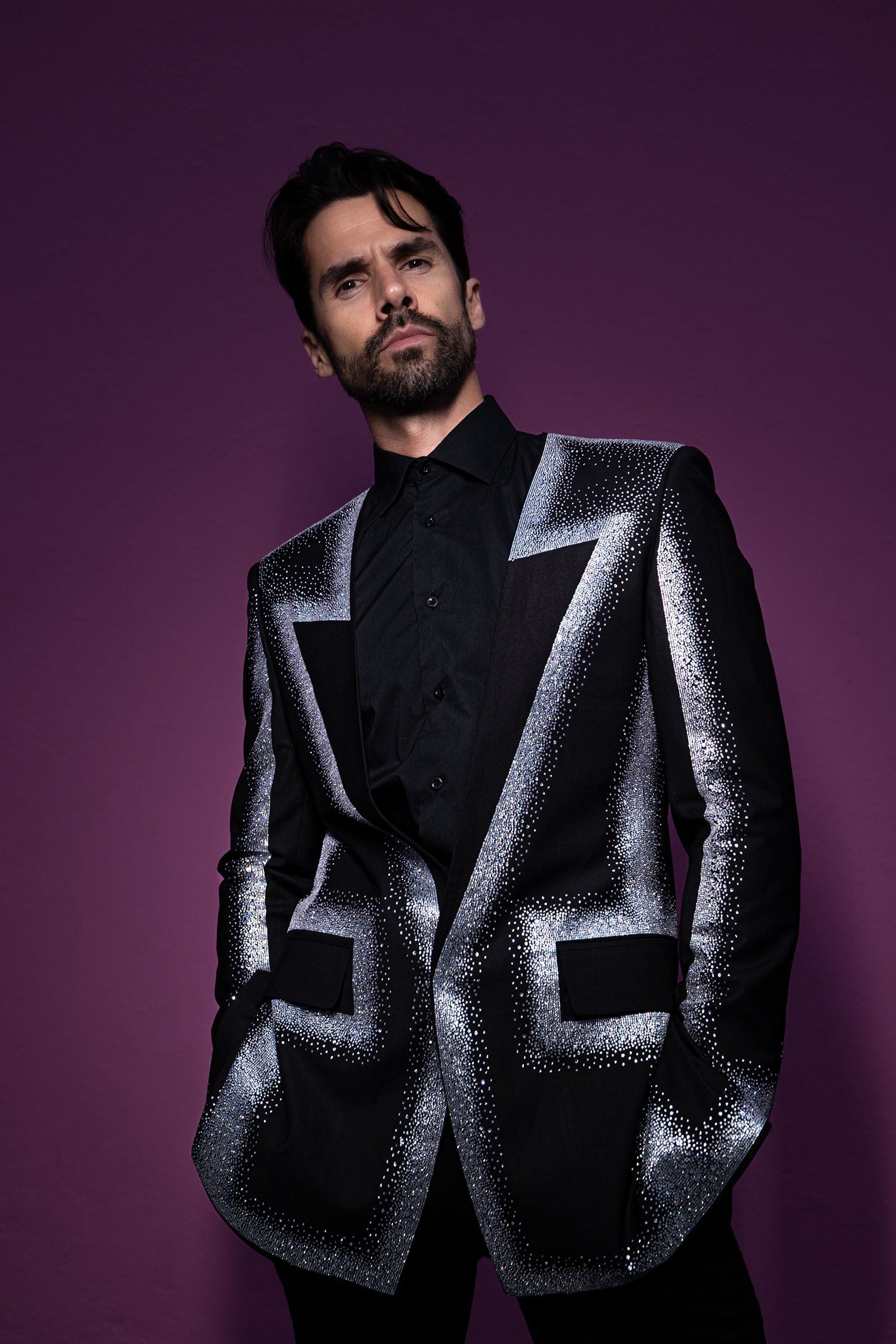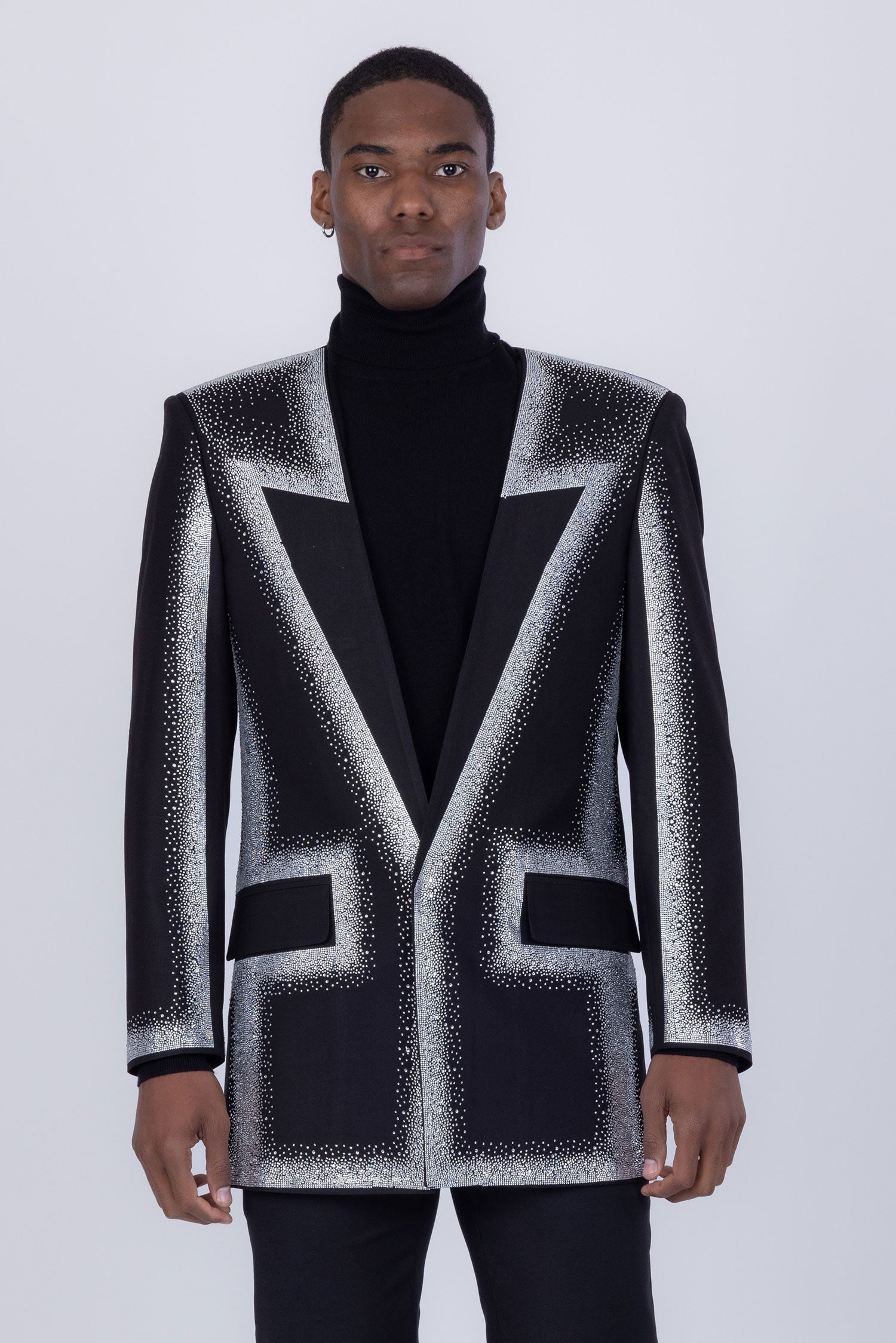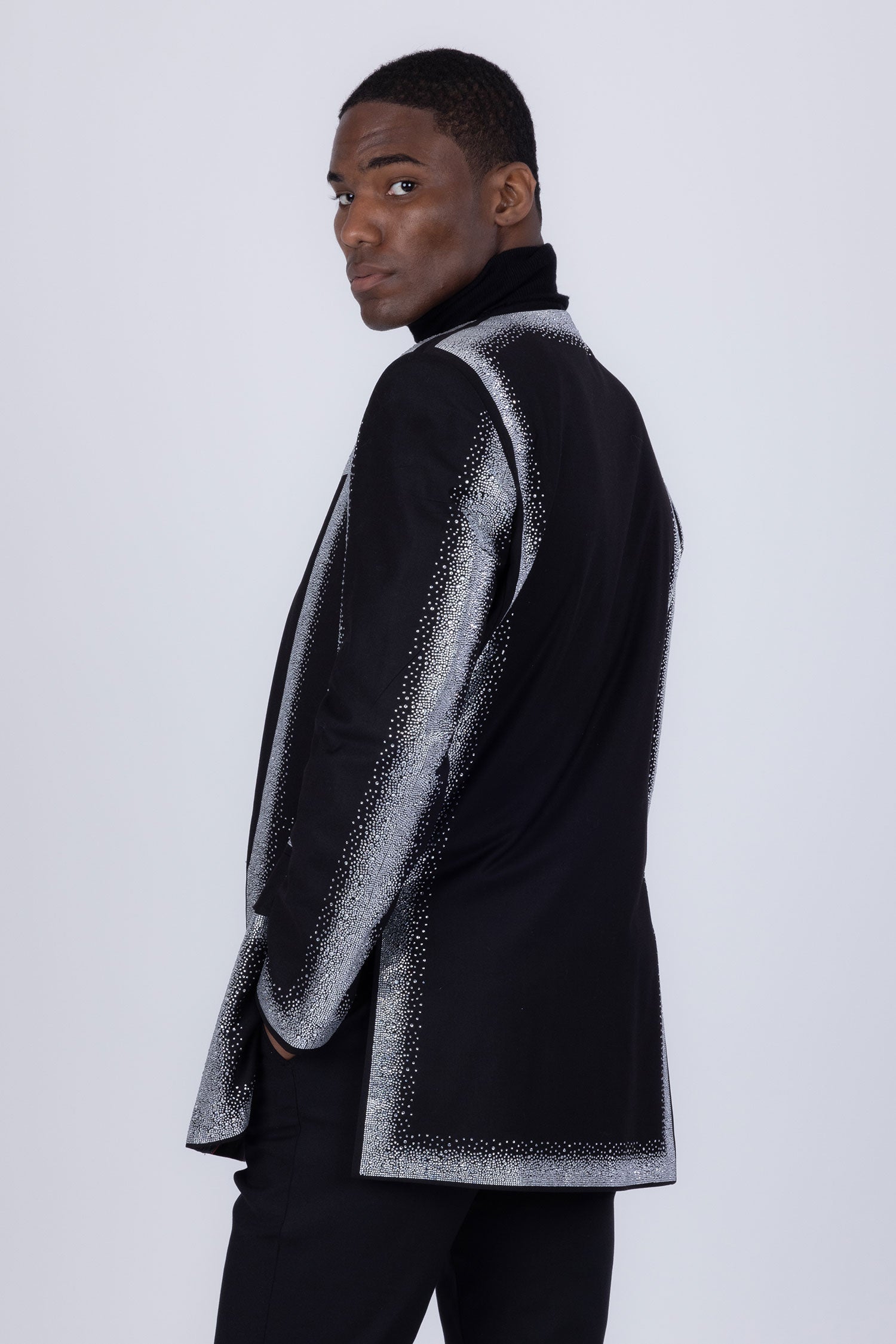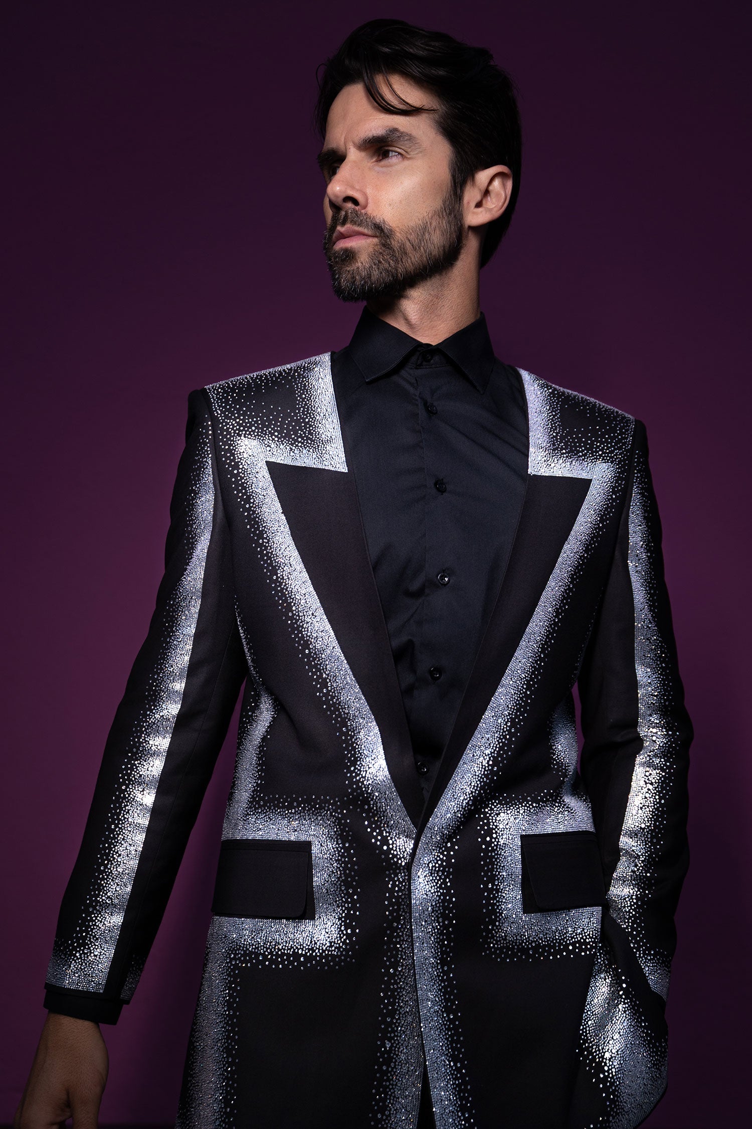 The Barabas collarless Chiba rhinestone men's blazer distinguishes itself with sophisticated geometric patterning that commands attention and projects self-assurance. Its distinctive design elements position you at the center of admiration while offering remarkable adaptability—functioning equally well in formal ensembles with coordinated trousers or more relaxed settings when paired with long-sleeved attire.