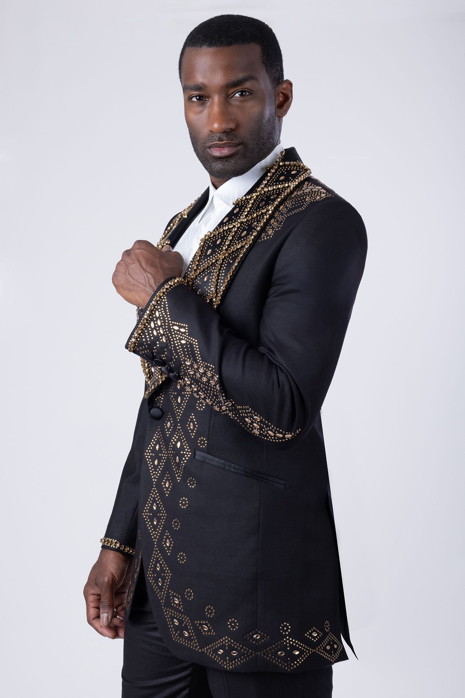 Experience sophisticated style and elegance with this Barabas men's blazer. Its geometric rhinestones and crystals design, shawl lapel collar, single-button closure, two pockets, and matte finish create a timeless look. Perfect for any occasion, this blazer's classic design and lining add a touch of polish to any outfit.