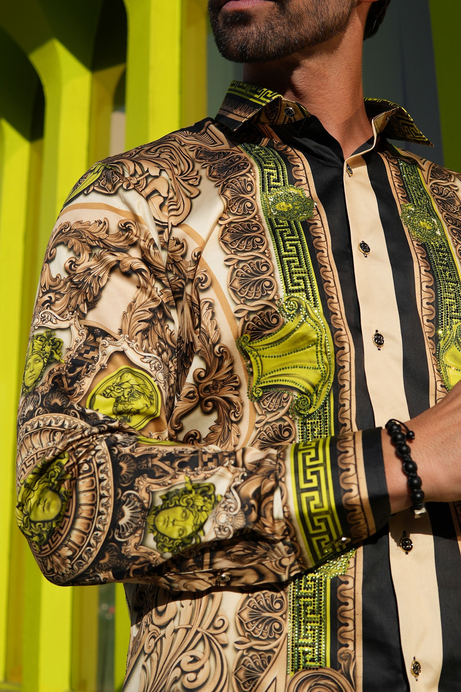 The Flamboyant Trend men's long sleeve shirt is a perfect choice for your formal wardrobe. Crafted from lightweight material, you'll get a slim fit with long-sleeves. Its hand-placed rhinestone Baroque design paired with a Medusa and floral print make it a unique and stylish statement piece. An original design created by renowned fashion house Barabas.