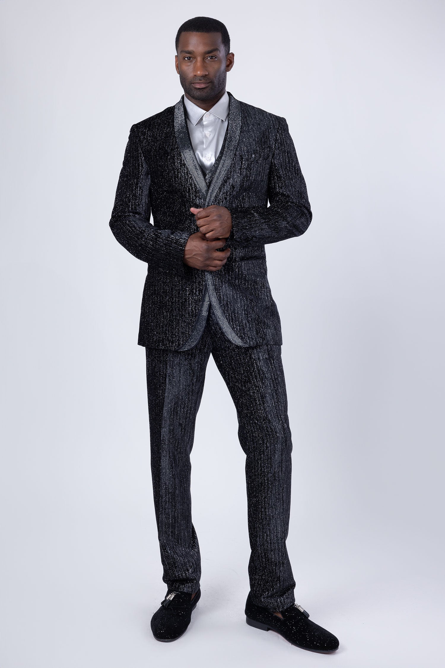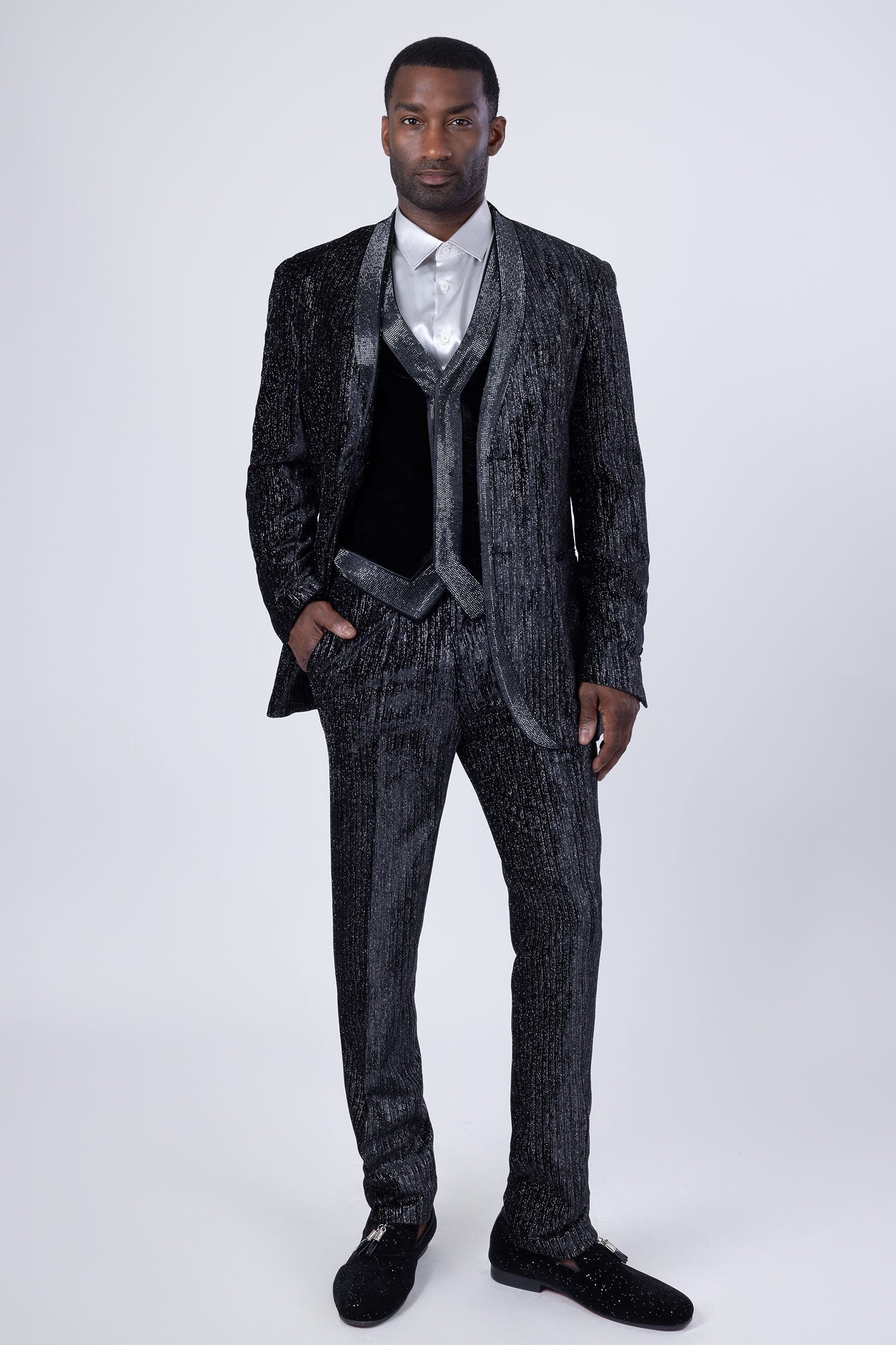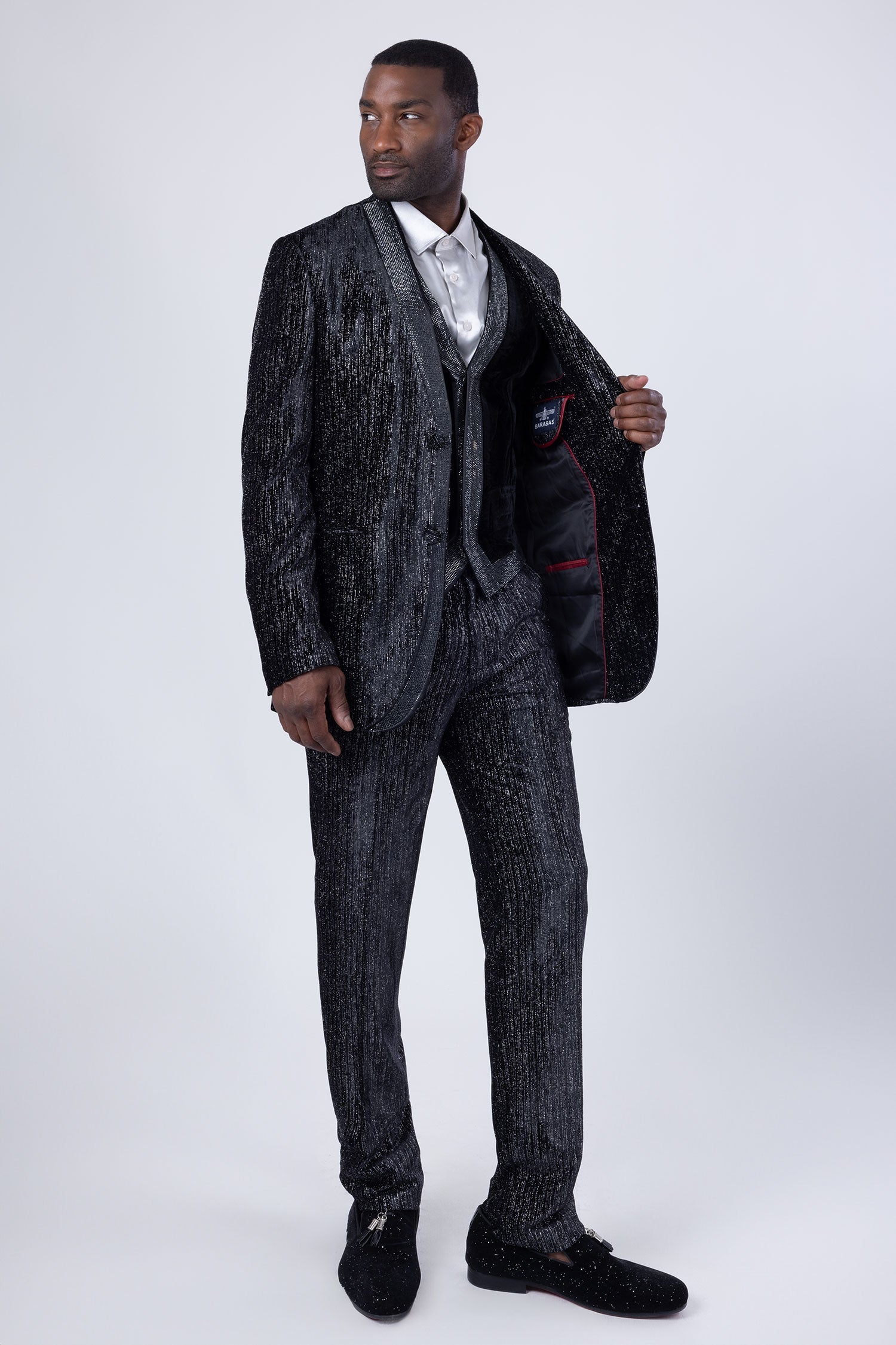 The Glimmerket men's glitter suit from Barabas features a luxurious velvet material, sparkling embellishments, a sleek shawl lapel collar, and a convenient two-button closure. Its timeless design and lining make it an ideal choice for any event, offering a sophisticated and chic appearance.