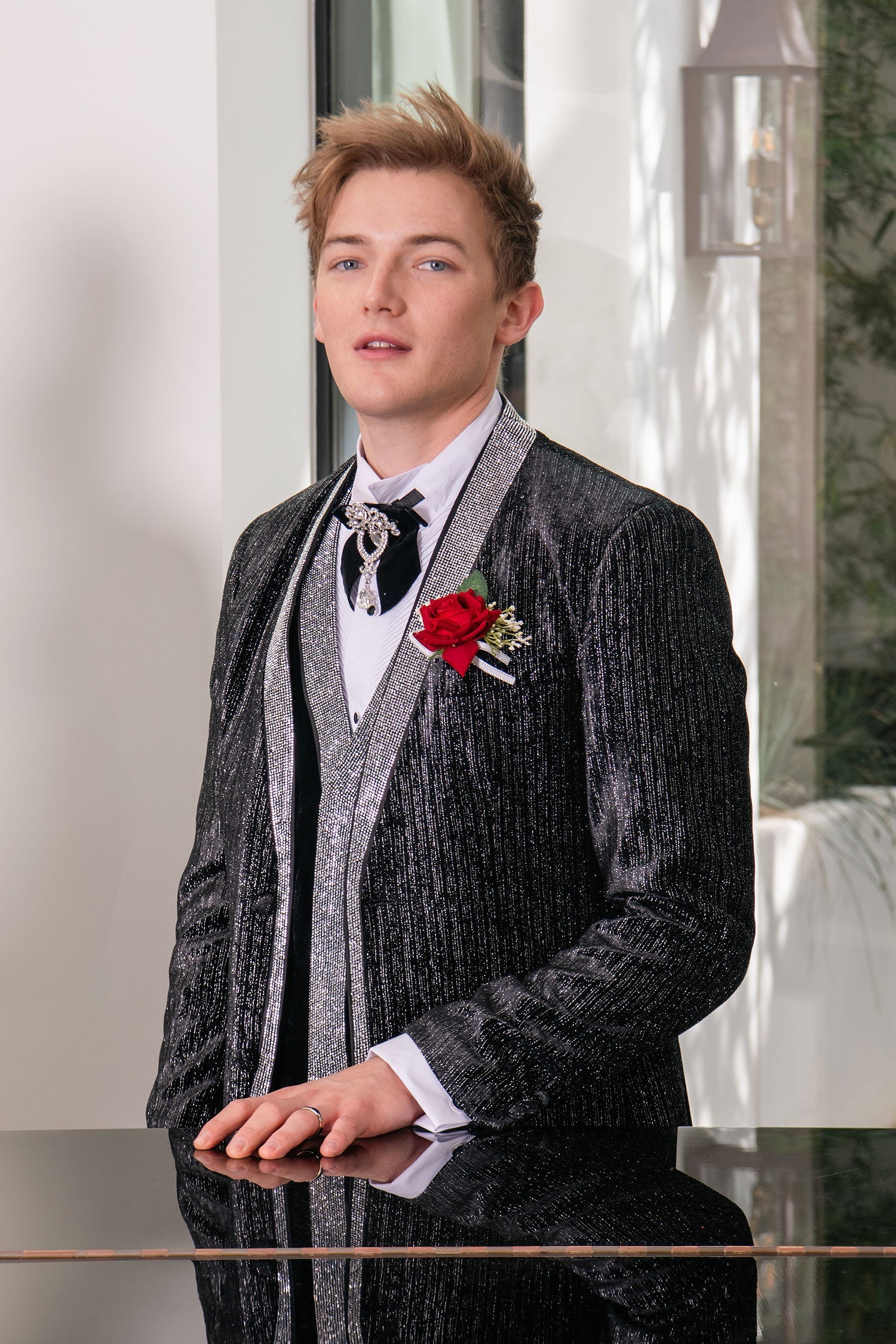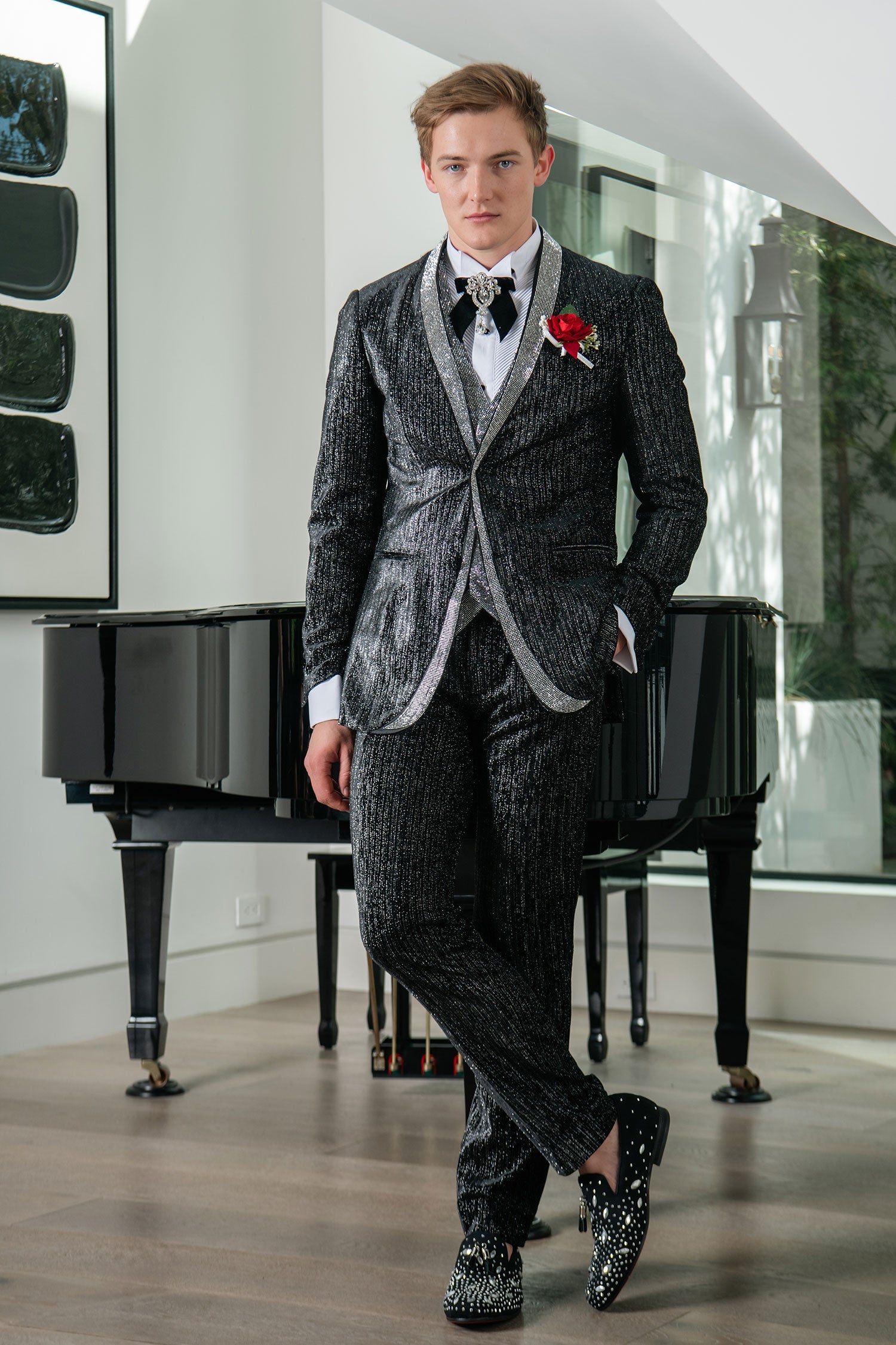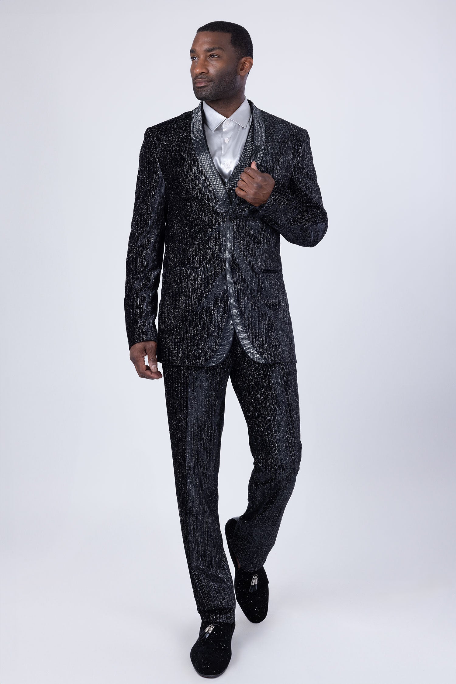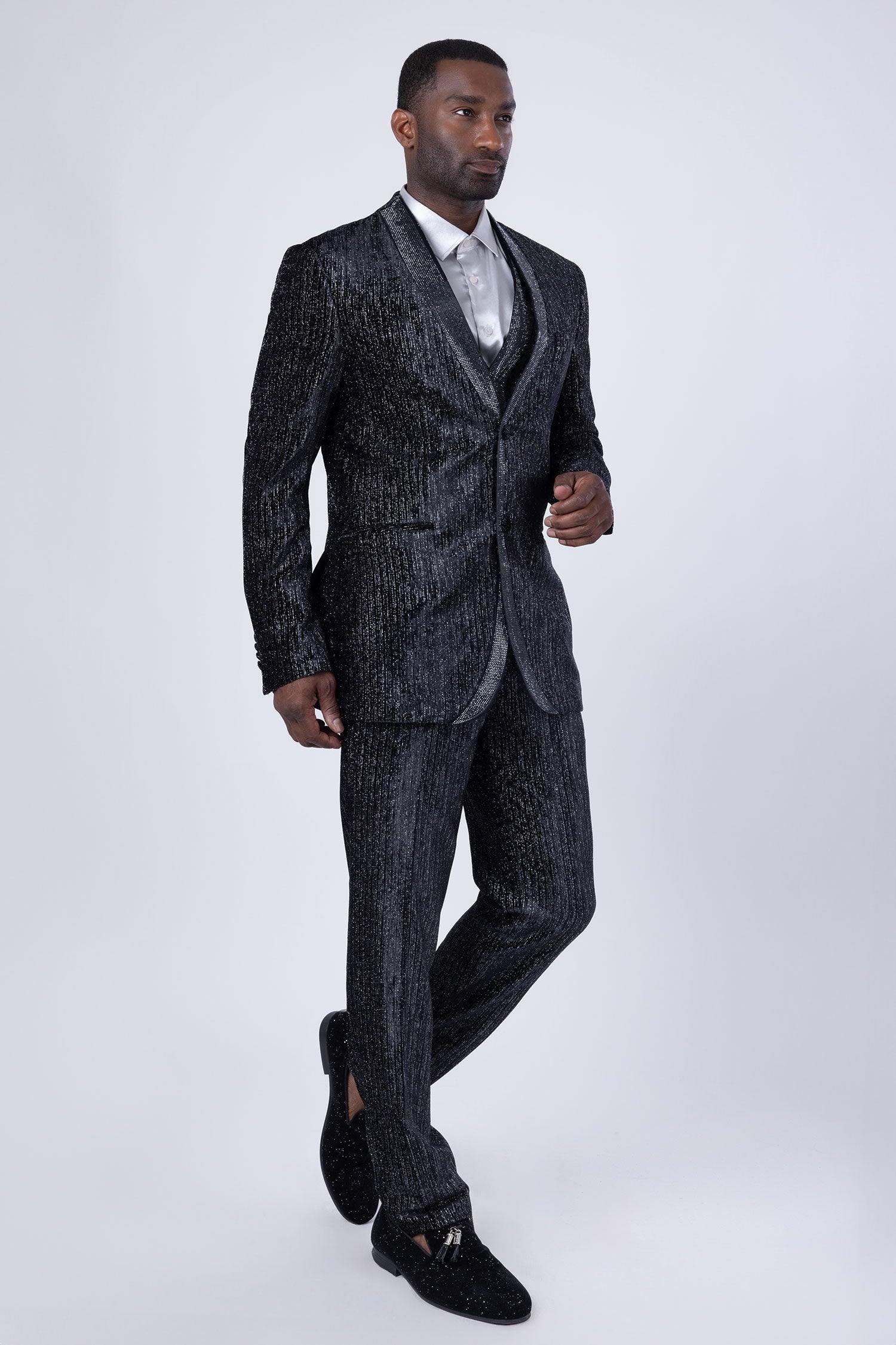 The Glimmerket men's glitter suit from Barabas features a luxurious velvet material, sparkling embellishments, a sleek shawl lapel collar, and a convenient two-button closure. Its timeless design and lining make it an ideal choice for any event, offering a sophisticated and chic appearance.