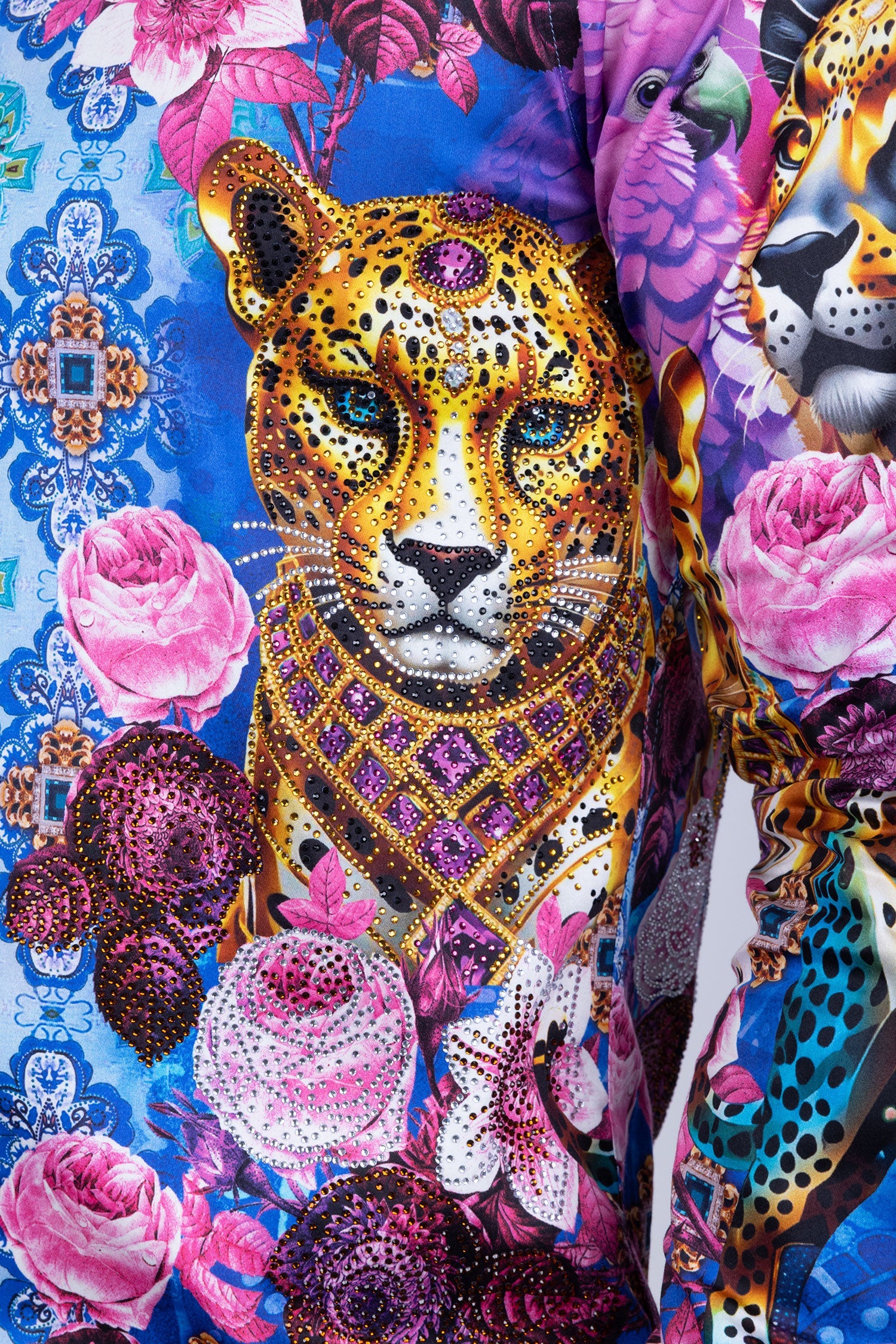 Introducing the Glowgaiter Rhinestone Long Sleeve Shirt from Barabas. Featuring a hand-placed rhinestone Baroque design, this lightweight shirt offers a tailored fit with unique floral, cheetah, panther and parrot prints. Elevate your wardrobe with this elegant and distinctive piece, designed by industry experts.