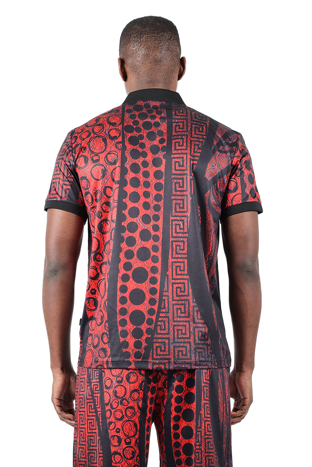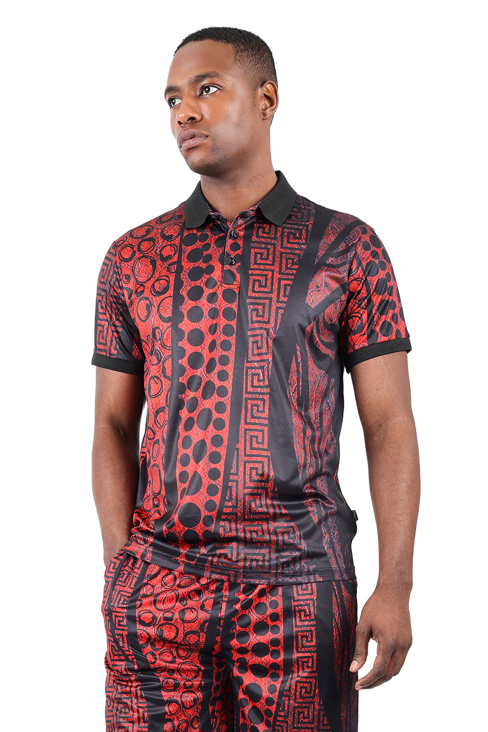Mania Mod short-sleeve polo shirts for men feature Barabas' printed Greek Key Pattern, a stylish polka dot design for a unique Baroque look. The lightweight fabric is contrasted with a ribbed collar and cuffs for comfort and a sophisticated edge. Perfect for any formal occasion.