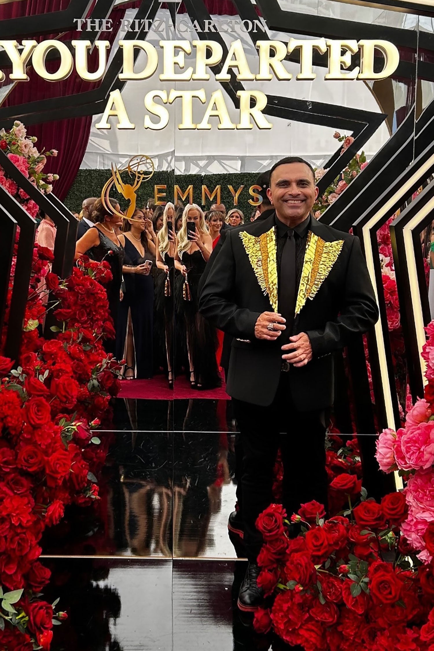 - Decorative peak lapel collar
