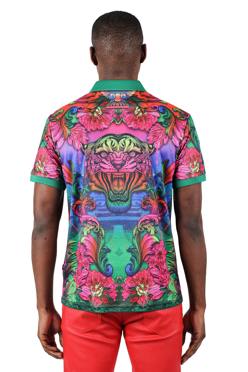 Our Barabas short-sleeved polos, constructed with a cotton blend fabric, provide an escape to a tropical haven. The Floral Angry Tiger Printed Luxury Design offers a lightweight feel while the ribbed collar and cuffs are the perfect touch of modern sophistication. Ideal for any formal event.