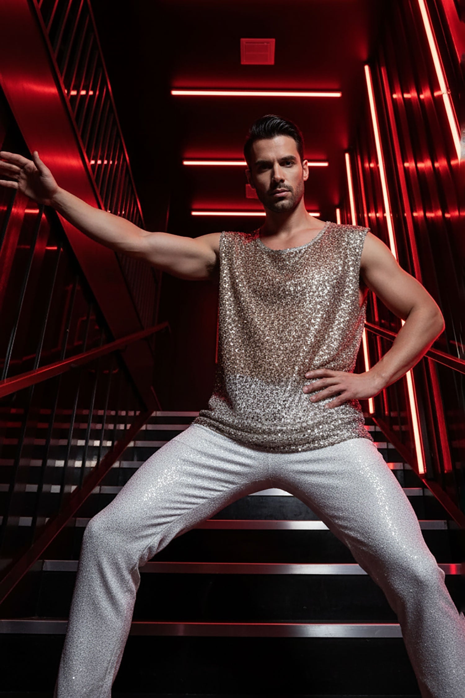 Elevate your collection with the Amman men's sleeveless shirt, featuring an elegant hand-applied sequin pattern and semi-transparent fabric. Its lightweight construction offers a refined shimmer, complemented by a distinctive crew neck collar that brings a contemporary touch. Designed by Barabas, this piece stands out as a sophisticated and fashionable choice for any wardrobe.