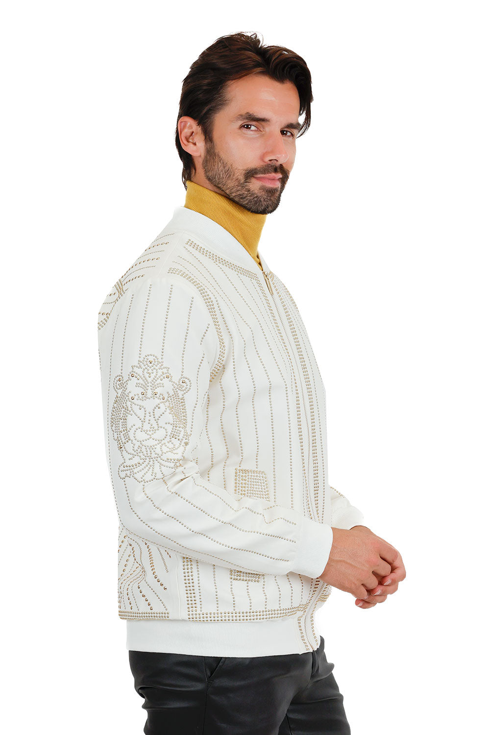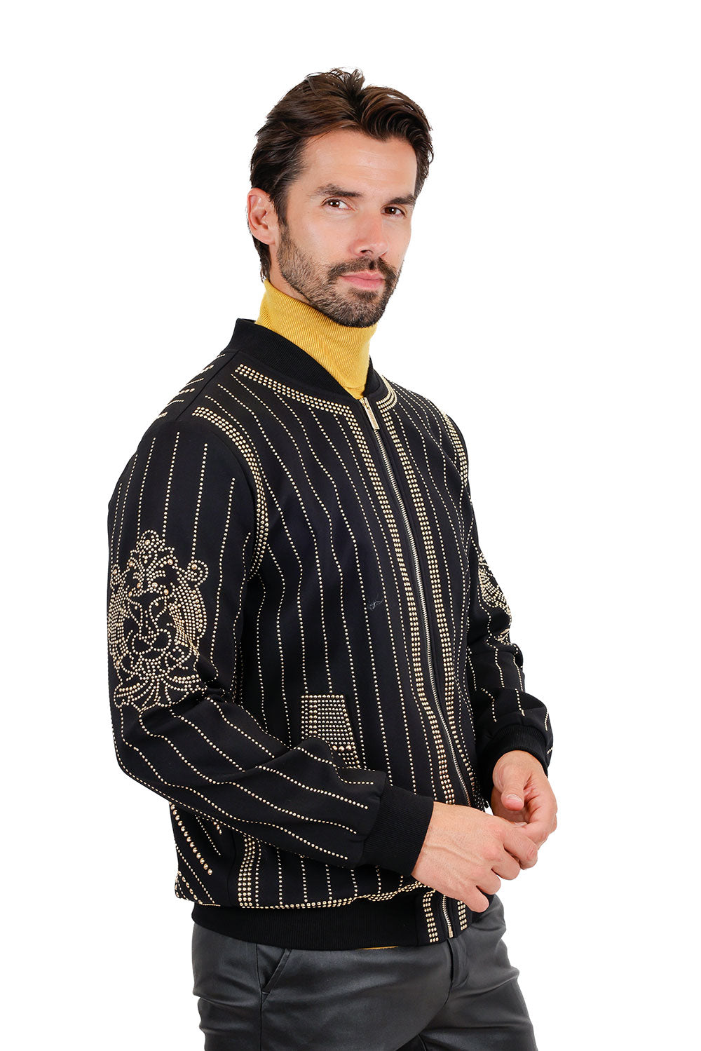 This classic cold-weather Barabas bomber jacket boasts a geometric lion stud pattern, high-grade material, and a unique striped and ribbed collar, hem, and cuffs design. Its sleek color blocking patchwork creates an eye-catching look.