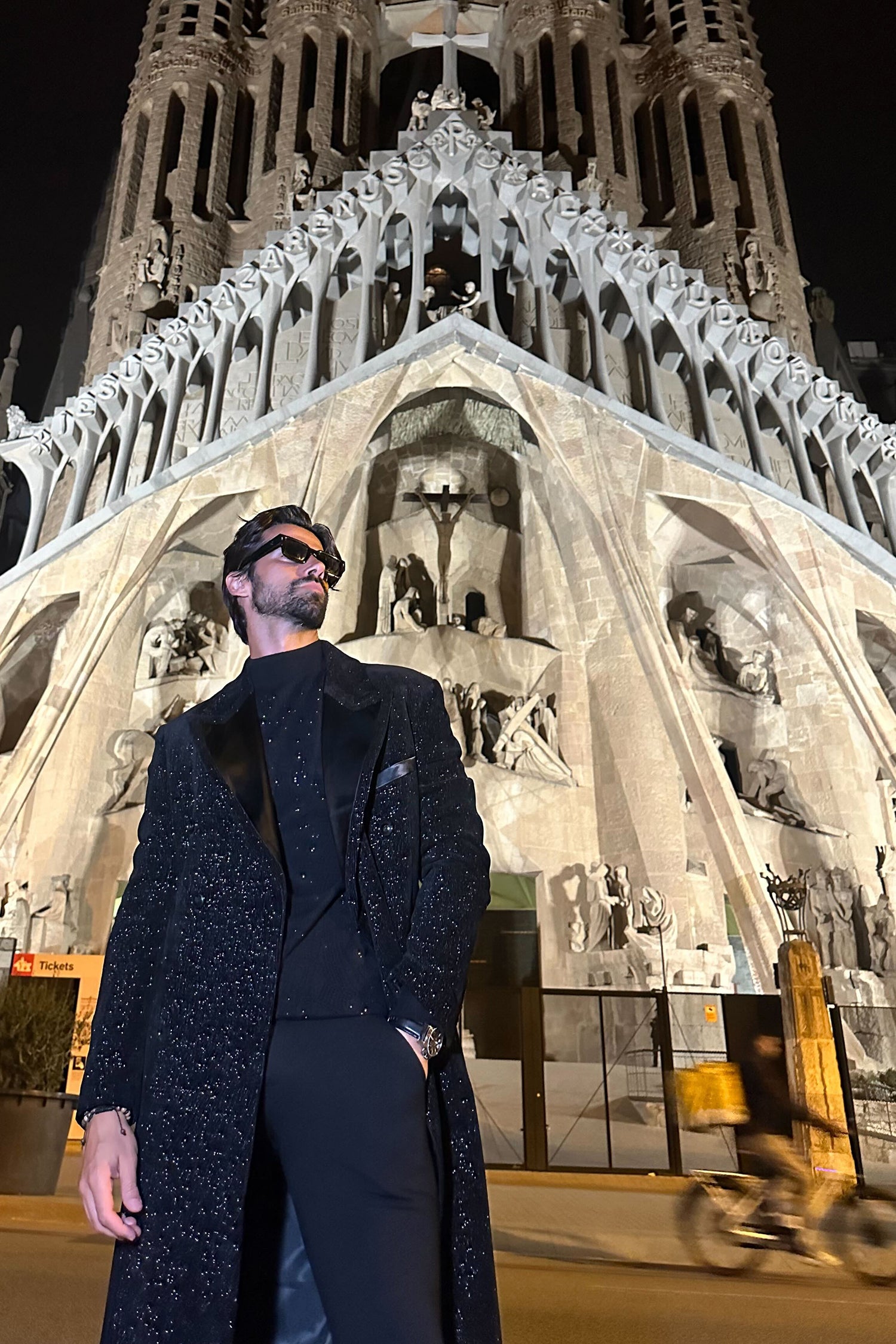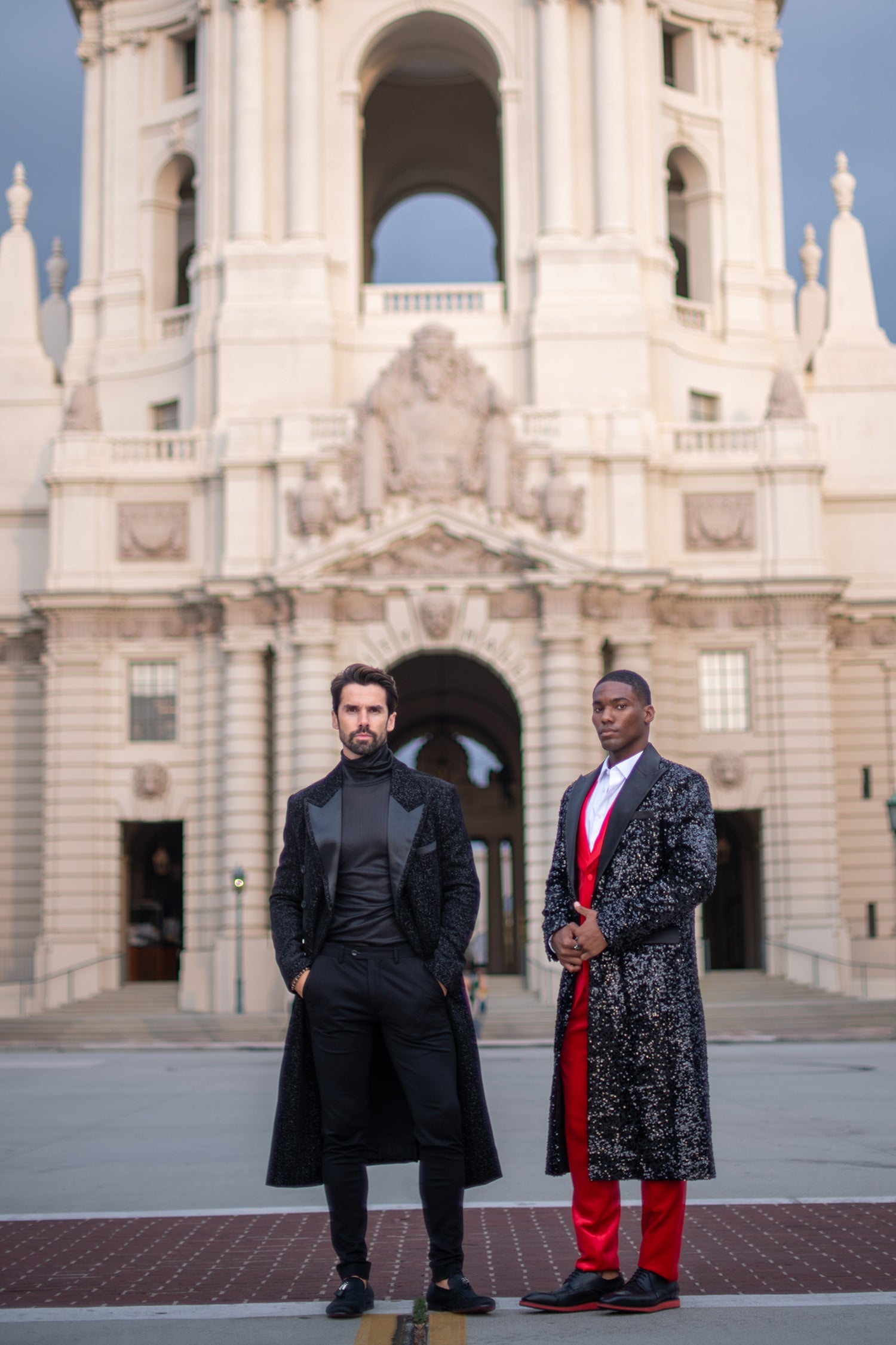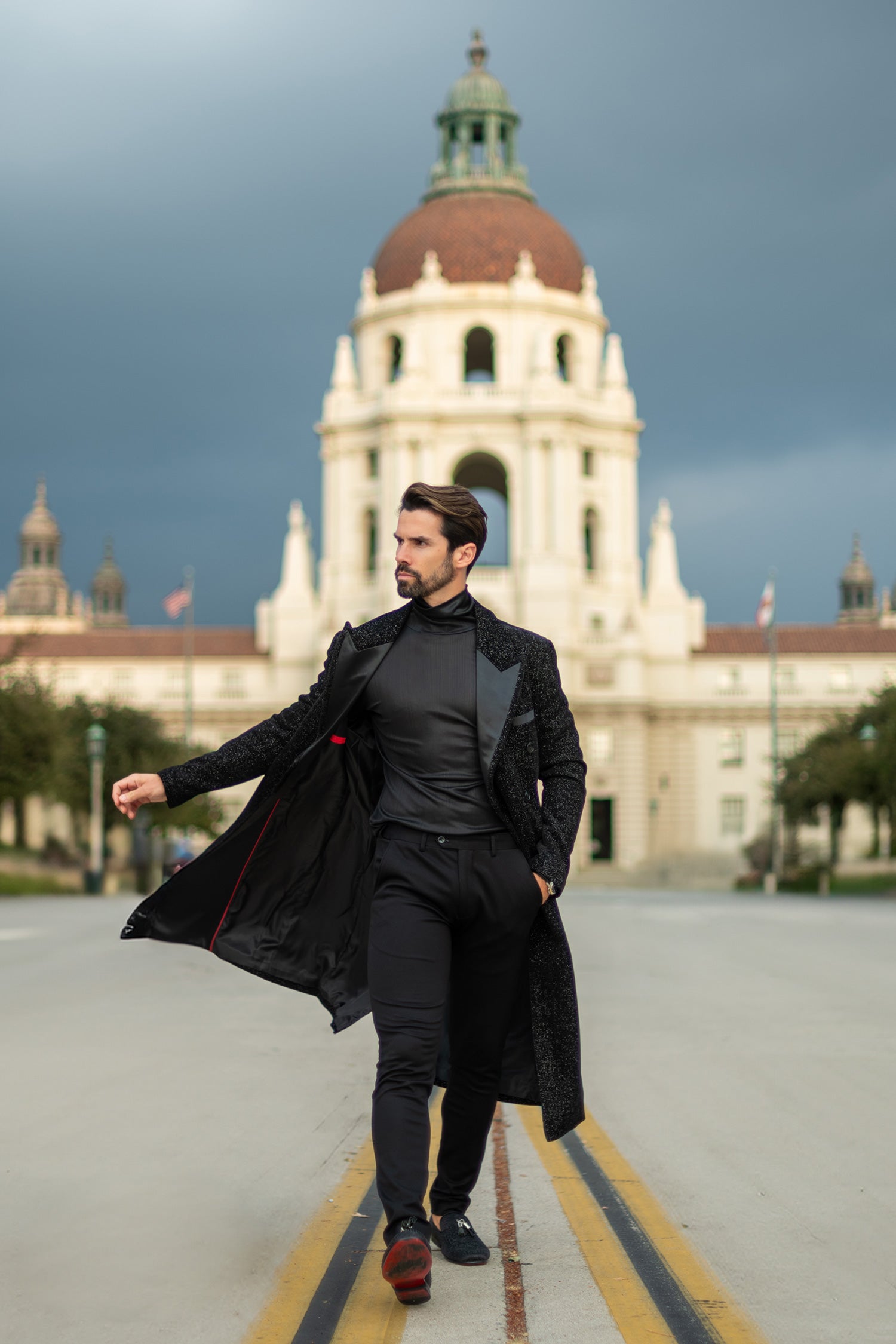 This Barabas long blazer features a striking satin lapel and body design, adding a touch of glitter effect, glamour and sophistication. Its versatility allows for both formal events and casual wear, making it perfect for all-day elegance.
