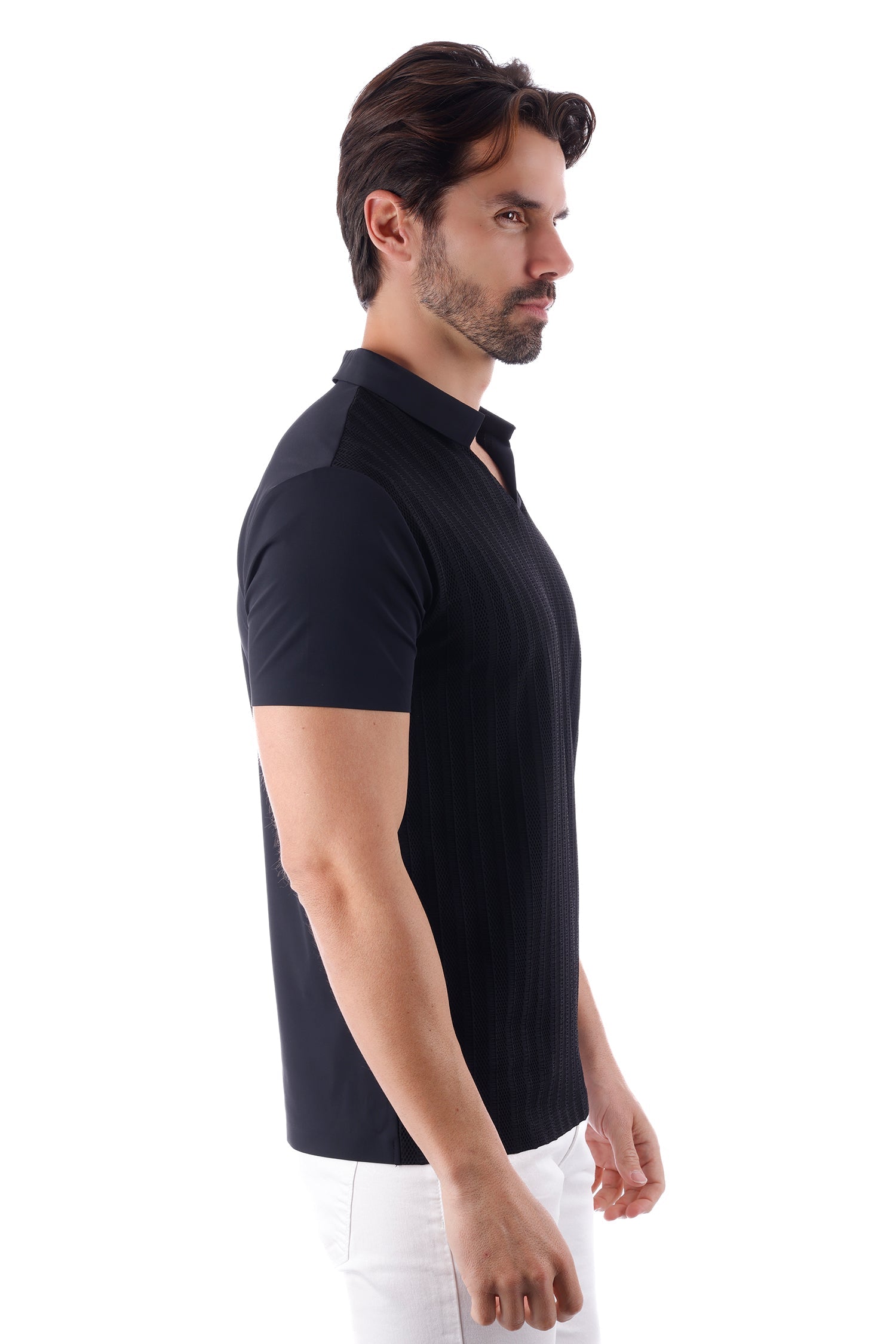 Barabas Polo shirt is a sophisticated, yet traditional design, featuring a responsible, no button V-neck collar with fitted cuffs. Made with highly stretchable and breathable fabric, this shirt is perfect for any occasion. The unique pattern adds an extra touch of style, making this polo shirt truly stand out.