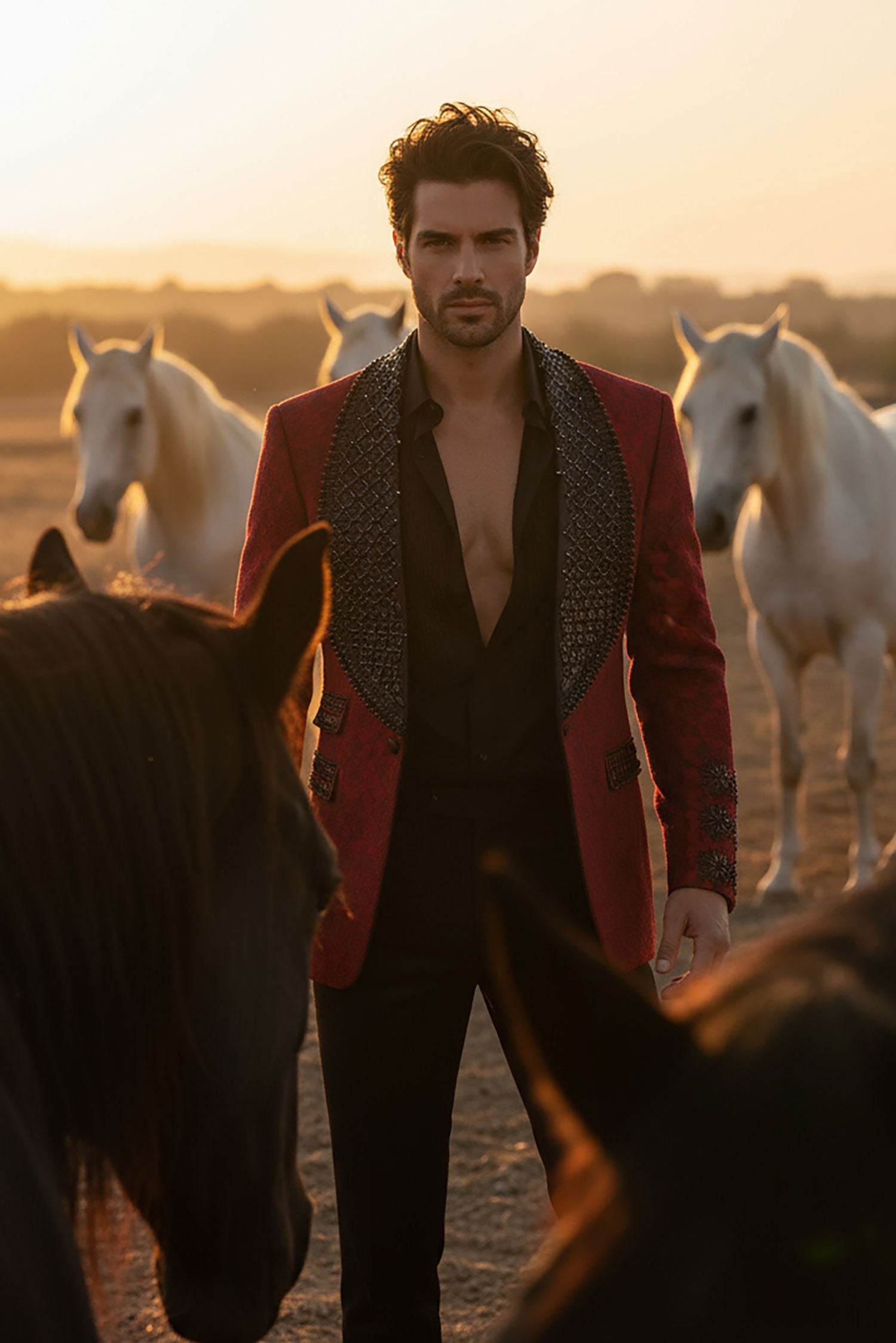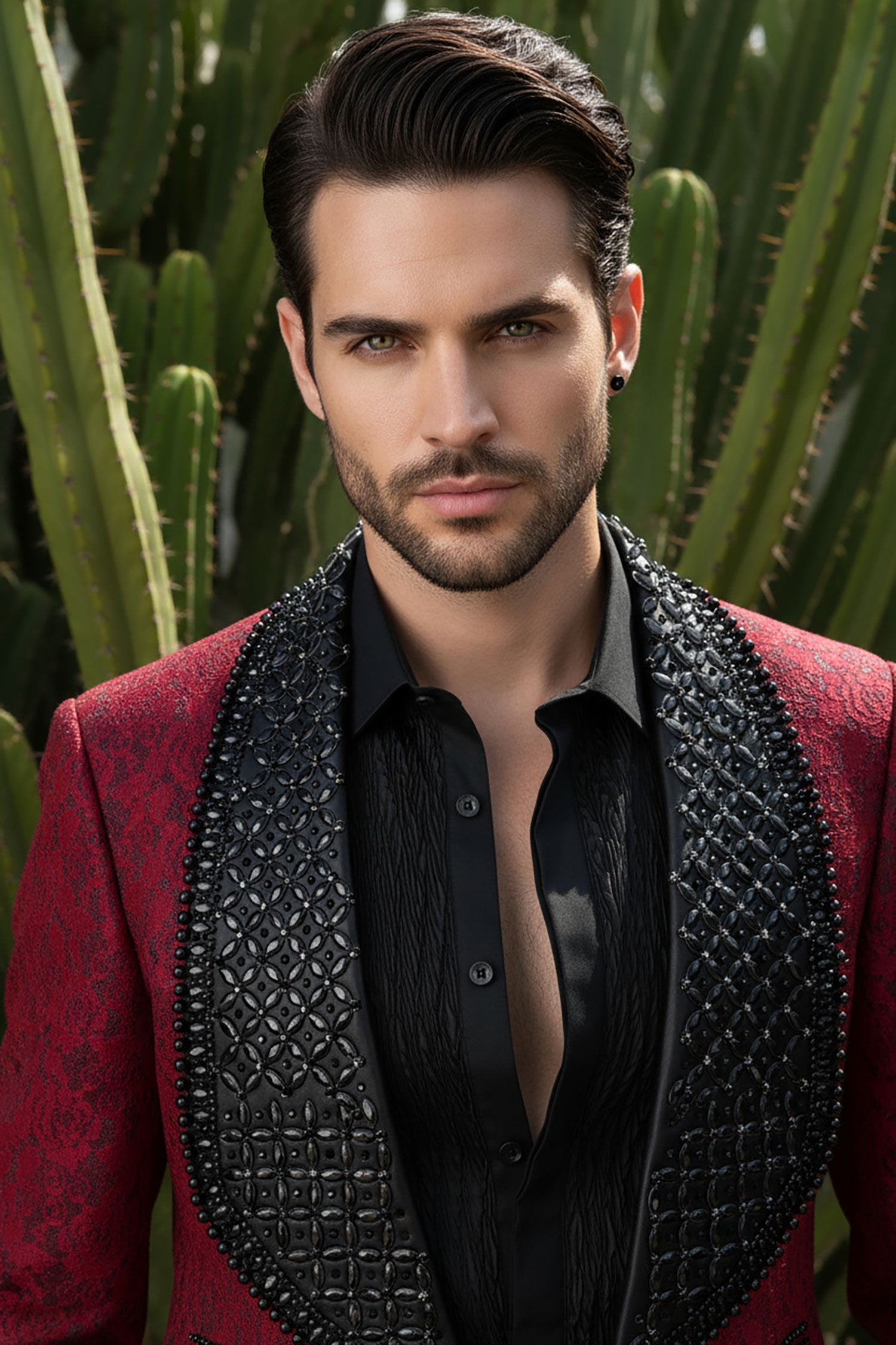 Crafted with precision, the slim fit design features a narrow point-to-point shoulder measurement and higher armholes for a flattering silhouette. Enhancing the look are rhinestone details on the collar, pockets, and sleeves, as well as a delicate floral lace design. The shawl lapel collar, long sleeve, and interior pocket add functionality to the elegant design, while the solid color lining complements the overall aesthetic. Part of the Barabas Elite collection, this men's blazer exudes high-end style and sophistication.