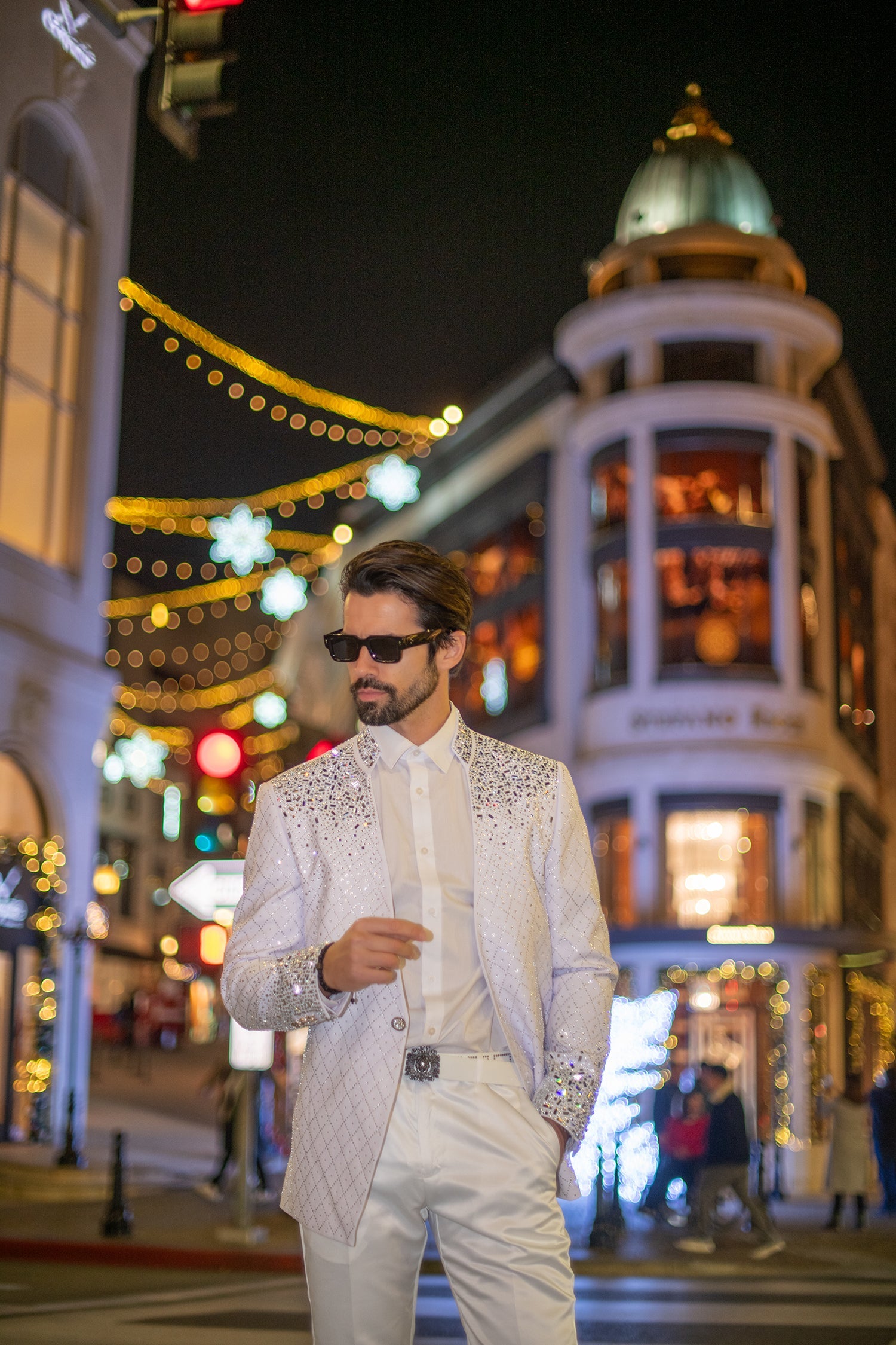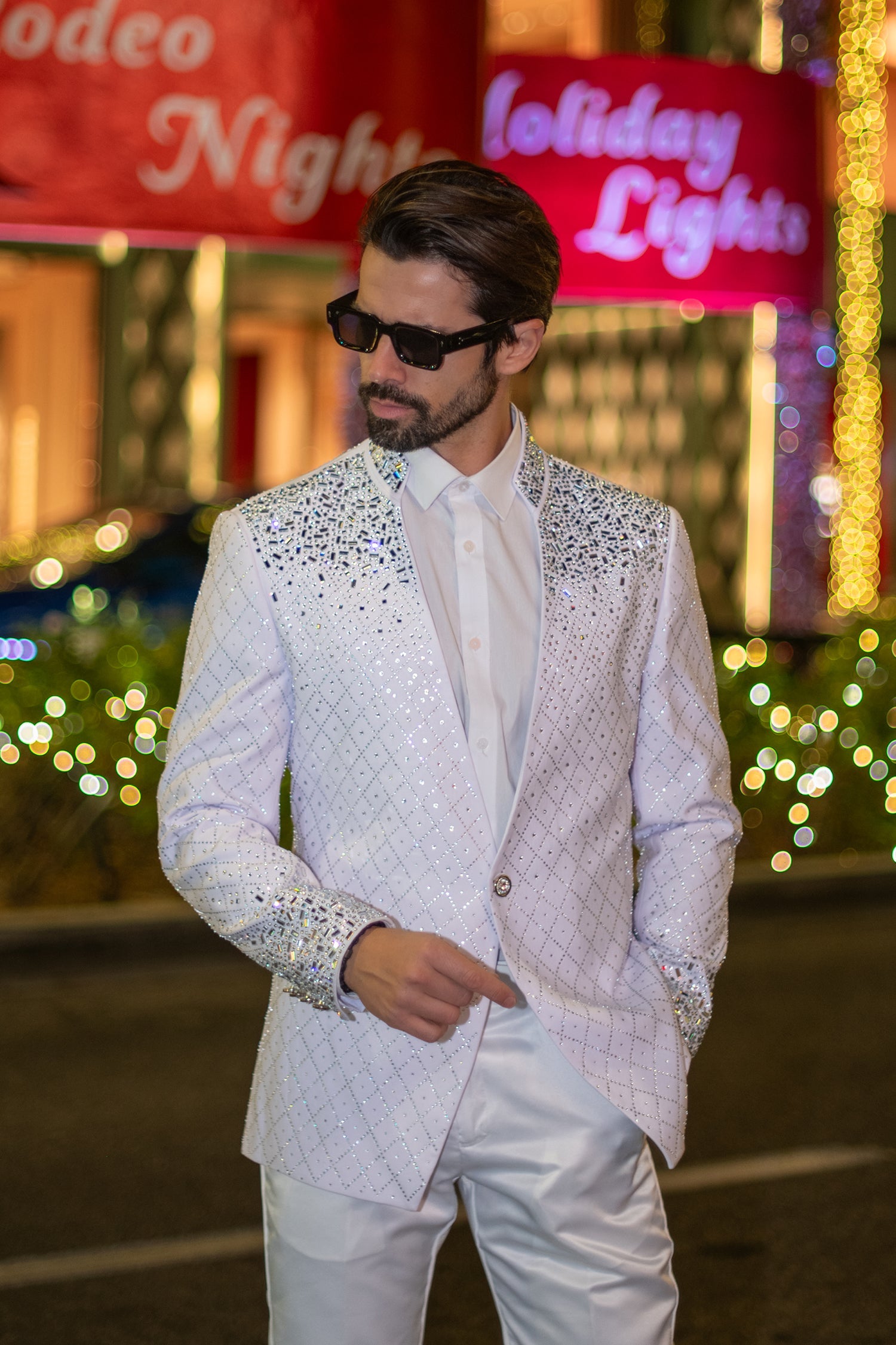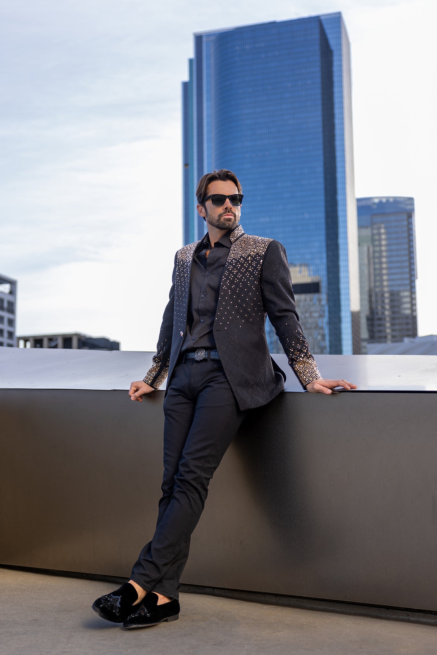 Crafted with precision and expertise, the Trivon Blazer's Slim Fit design features a slim point-to-point shoulder measurement and elevated armholes for a sophisticated silhouette. The sparkling rhinestone detailing on the collar, pockets, and sleeves, along with the delicate geometric pattern design, add to its elegant appearance. Functional elements such as the Henley lapel collar, long sleeves, and interior pocket, paired with a solid color lining, further elevate the blazer's refined look. Part of the Barabas Elite collection, this blazer showcases luxurious style and impeccable craftsmanship.
